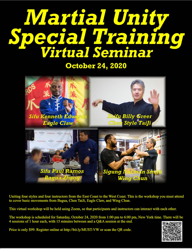 Uniting four styles and four instructors from the East Coast to the West Coast. This is the workshop you must attend to cover basic movements from Bagua, Chen TaiJi, Eagle Claw, and Wing Chun. The emphasis will be on applications derived from those basic movements. You will learn effective joint locking, throwing, and striking techniques. Whether you are an expert in the art or a beginner, you will come away with new skills and understanding of these arts!